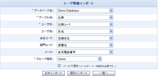 | 全件インポート | 指定したテーブルにある全てユーザ情報をインポートします。 |