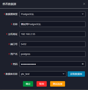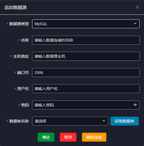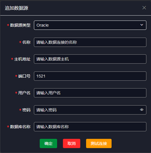 | 10 | 测试连接 | 输入要连接的数据源信息后点击,测试数据源是否有效 |